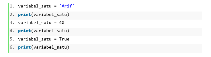 Pada baris 1, variabel_satu berisi String ‘Arif’. Pada baris 3 ,